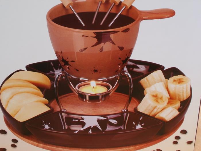 Im Fondue-Set sind außerdem vier Schälchen und Fonduegabeln enthalten. Es ist auch geeignet für Schokoladenfondue. In den Schälchen können dann zum Beispiel Bananenscheiben, Ananasstücke, Erdbeeren und andere Köstlichkeiten angeboten werden.
